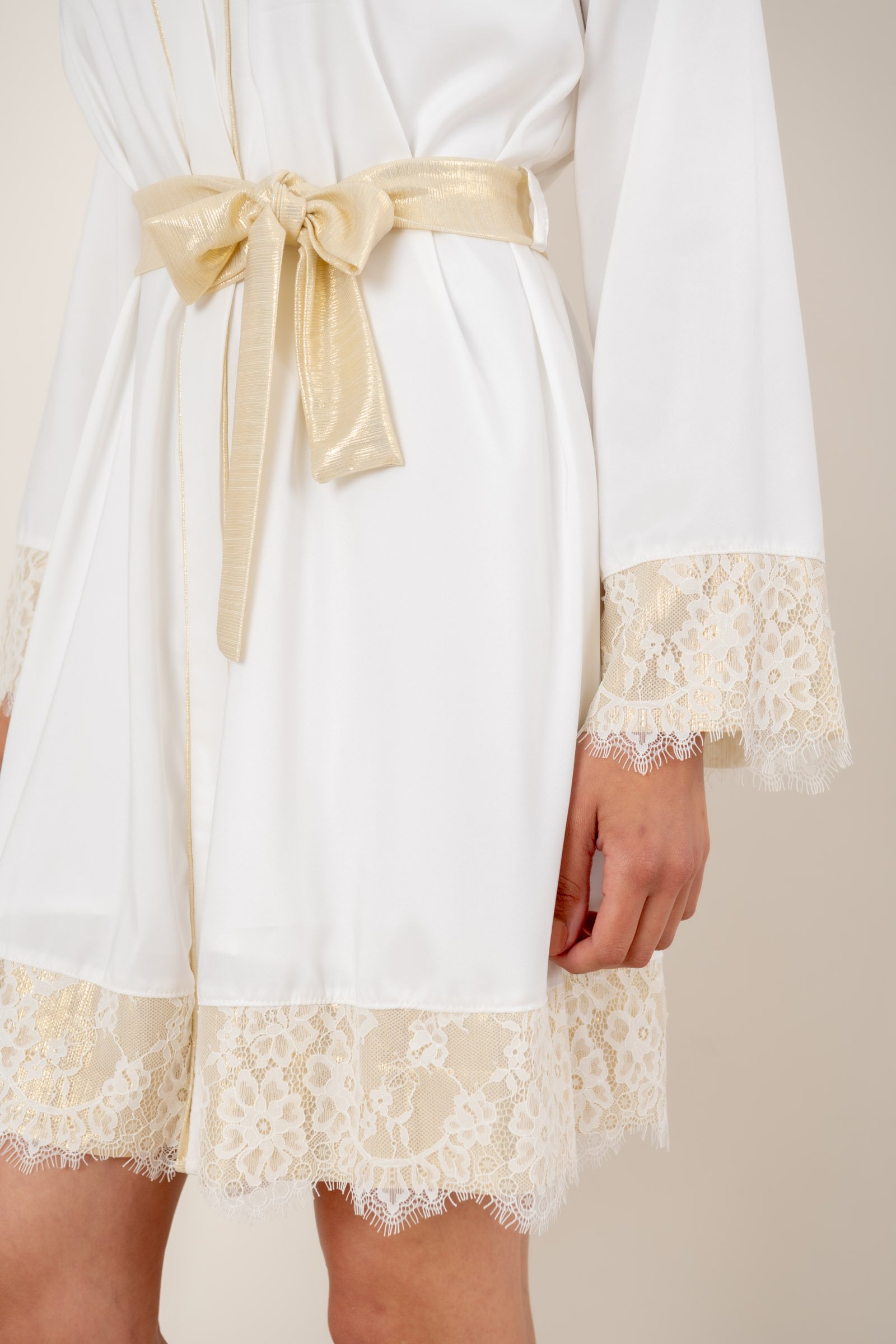 Confeccionada en satén de lencería y terminaciones delicadas en encaje, combina suavidad, brillo sutil y un estilo único.