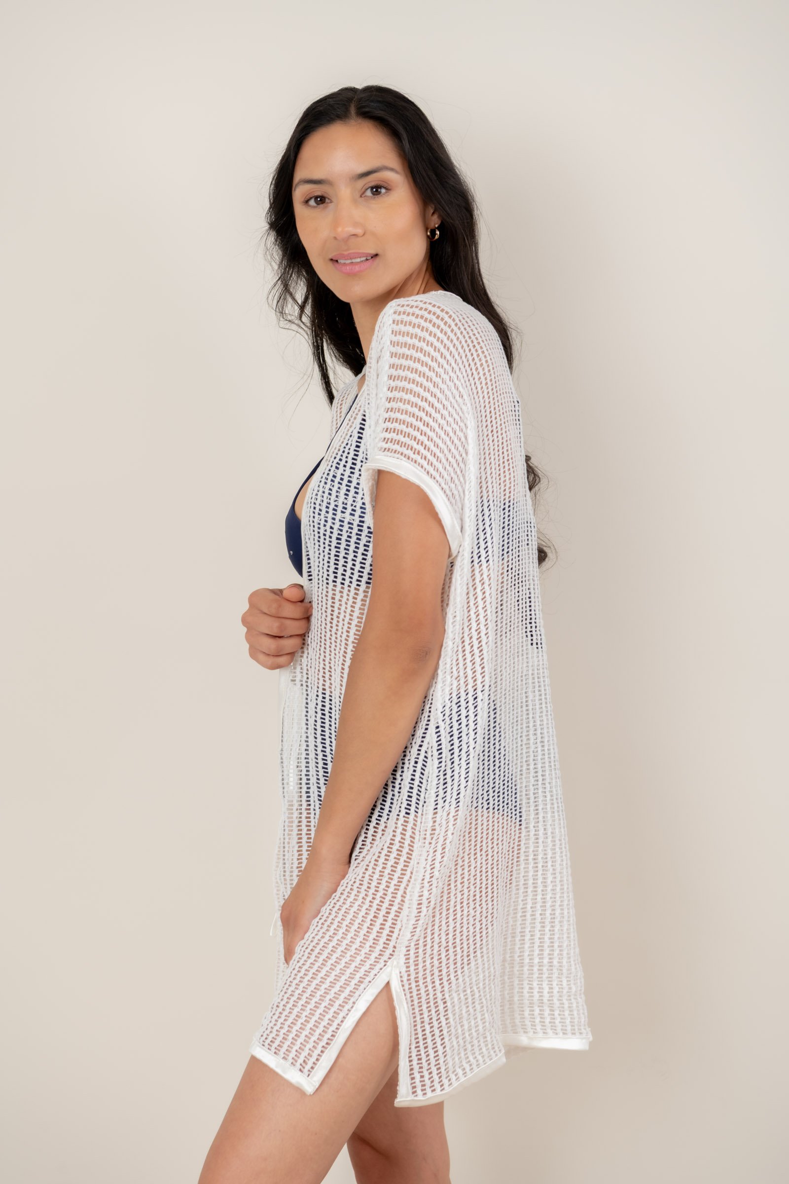 El vestido Nacar, confeccionado en un tejido de crochet con terminaciones satinadas, es perfecto para la playa o la piscina. Su diseño ligero y fresco, con un lazo para atar al frente, te aporta comodidad y estilo para disfrutar de los días de sol.